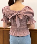 背中に施された大きなリボンがポイントのシャーリングブラウスはカジュアルながらも女性らしく決まる今季外せないアイテム! スクエアネックのデザインがデコルテ周りを綺麗に魅せ、顔周りも明るくしてくれます◎ 襟元にゴムが入っているのでオフショルにして着用しても◎