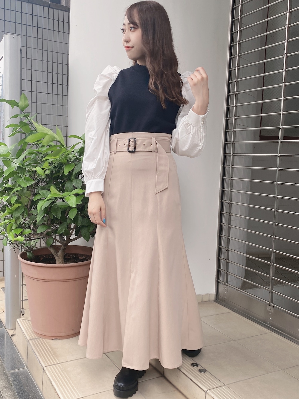 マーメイドシルエットが女性らしさをプラスするスカートは前部分に施されたスリットでより大人っぽく仕上がります。 同素材のベルトも付いているのでウエスト周りにアクセントがつき、 簡単にスタイルアップ効果も期待できます◎