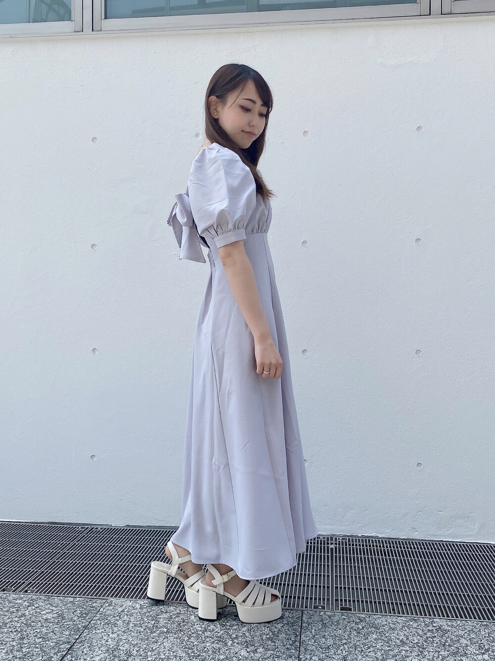 背中に施された大きなリボンがポイントのワンピース。 ハイウエストのディテールなので1枚でスタイルアップ効果に◎ 気になる二の腕周りもスッキリ隠してくれるボリュームスリーブも嬉しいポイント。 ほんのりと背中の肌見せも叶うアイテムなのでこれからのシーズンに欠かせません♡