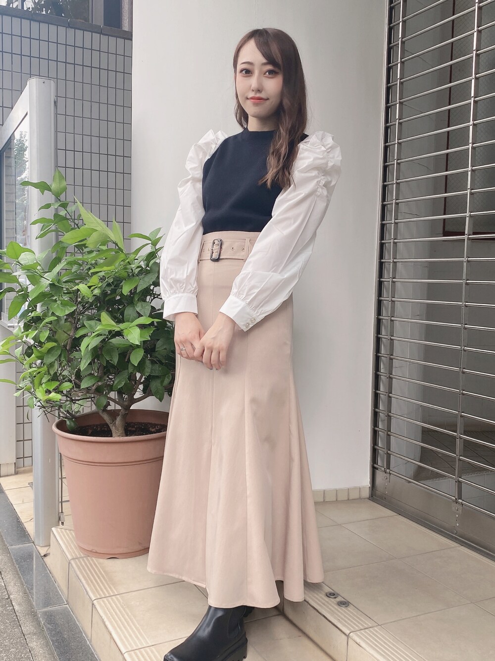 マーメイドシルエットが女性らしさをプラスするスカートは前部分に施されたスリットでより大人っぽく仕上がります。 同素材のベルトも付いているのでウエスト周りにアクセントがつき、簡単にスタイルアップ効果も期待できます◎
