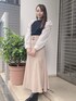 ベージュ系のスカートを着用したレディースの秋コーディネートの1枚目の写真