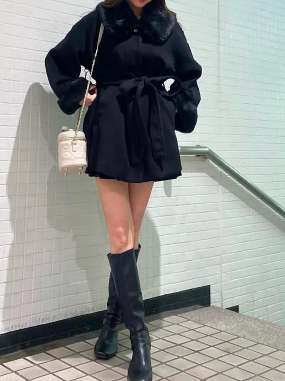 onewayのノーカラーコート「ファー付きウエストリボンコート」を使ったコーディネート