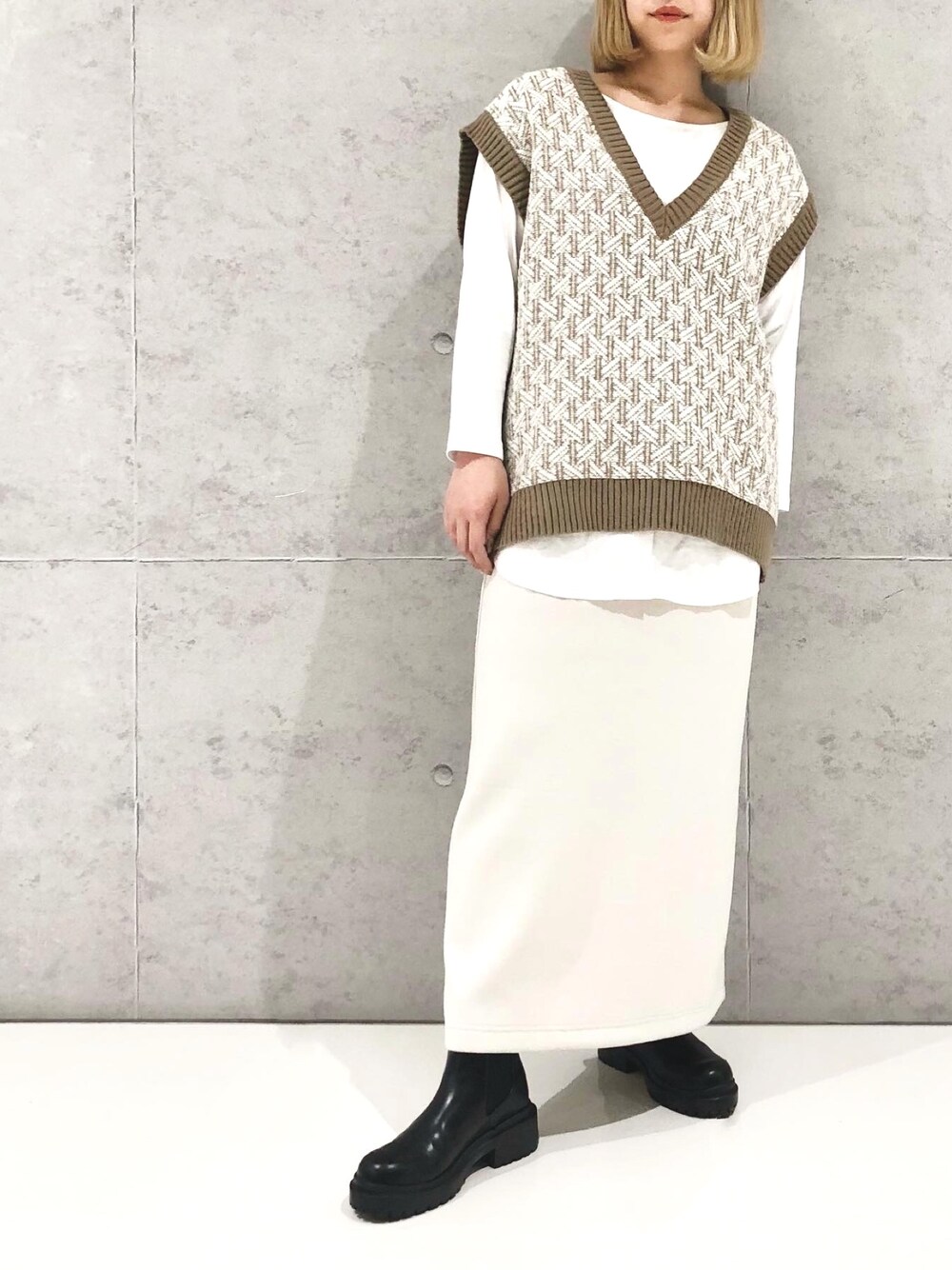 —————————————— .st staffboard⇨エムアイ Instagram⇨@lp_em_i —————————————— 今年トレンドのニットベスト。主張しすぎない幾何学模様が、オシャレ度をグッと上げてくれます。身幅・アームホールはゆったりめ、お尻が隠れるまでの長さもあります。 スカートは、タイトすぎない形で脚のラインが出にくいです。生地にやや厚みがあり、裏起毛のような触り心地なので、これから寒くなる季節にもオススメ✨