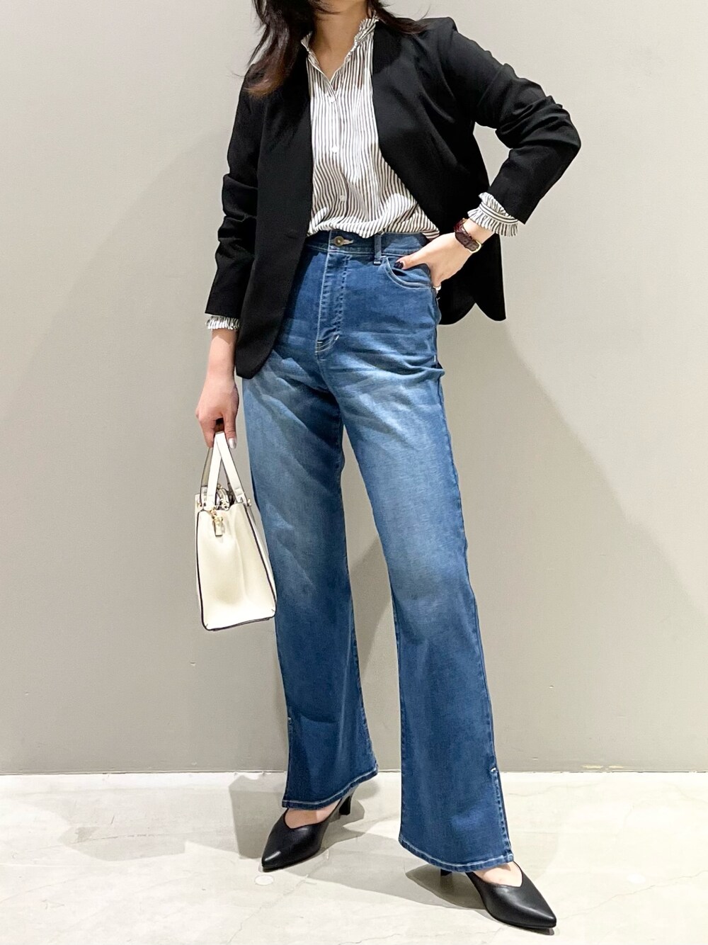 エムアイ(LEPSIM 阿倍野キューズモール店)のデニムパンツ「フレアスリットデニムパンツ 295668」を使ったコーディネート