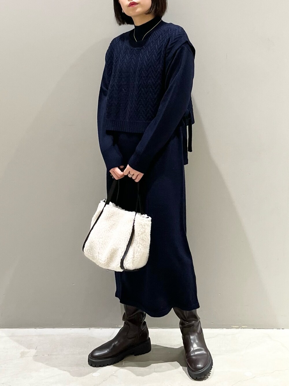 エムアイ(LEPSIM 阿倍野キューズモール店)のマタニティウェア/グッズ「【洗える】マタニティ/7ゲージニットベストSETワンピ―ス 173468」を使ったコーディネート