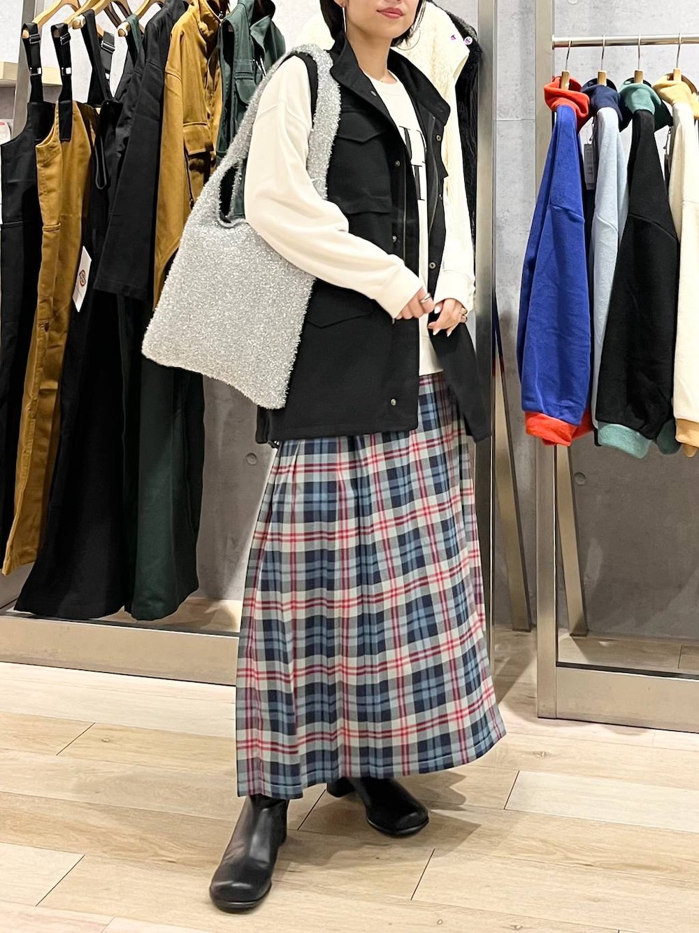 いつもご覧頂きありがとうございます✨☺️ フォローもして頂けると、とっても励みになります! 一部店舗とWEB限定のベスト! 阿倍野店にも入荷したので、早速着てみた🔥 オーバーサイズで、ヒップ下まで着丈があるから、 気になる腰回りお尻周りもしっかりカバーできました✨ ウエストが絞れるようになっているので、 メリハリをつけて着られるのも嬉しいポイント。 スカートは、巻きスカートのようになっていて、 ウエストもボタンで留めるこだわりのデザイン。 歩幅が広い私でも、問題ないくらい裾が 広がってくれるので、階段3段飛ばしも余裕でした (大胆すぎる)😑✨ 162センチの身長で、くるぶしあたりまで長さがあります。