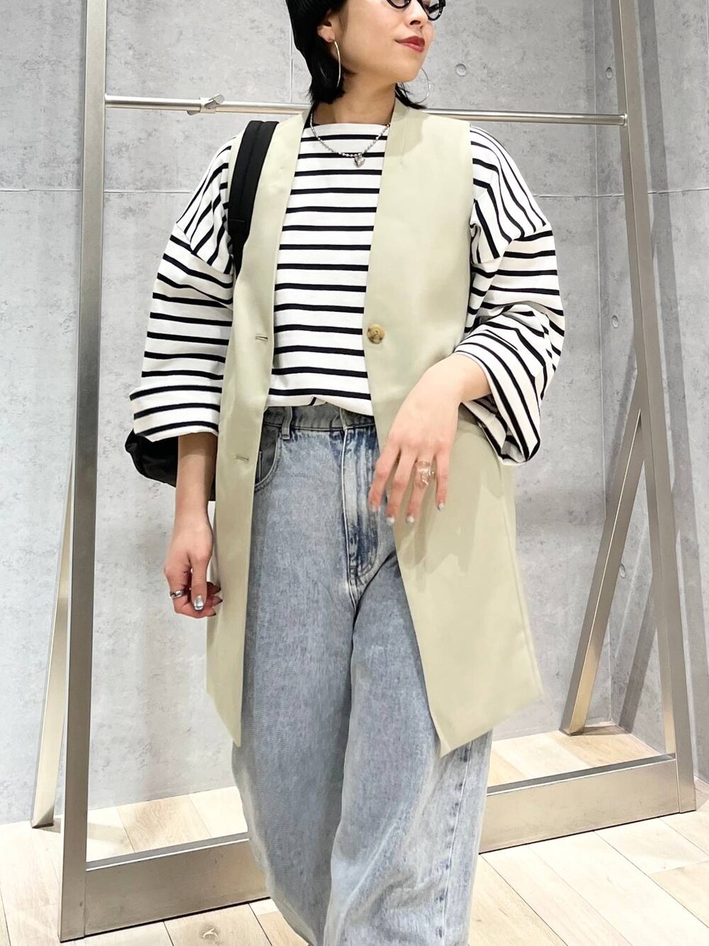 いつもご覧頂きありがとうございます✨☺️ フォローもして頂けると、とっても励みになります! 前々回アップしたセレモニーのジレを 普段着使いで合わせてみました。 春っぽいカラーでこれからたくさん使えそうです! ジレは、ストンと生地が落ちるので、気になる腰回りもカバーしてくれます。162センチの身長で、太ももあたりまで着丈がありました。肩幅が広いことがコンプレックスなのですが、こちらは縦ラインを強調してくれるので、肩周りも全く気になりませんでした。着用される際、後ろのバッテンの糸を取るの、お忘れなく😀 ボーダーTシャツの袖の緩さがかわいい!!袖の幅広だと、手首が細く見えるのでありがたい🥲袖を2回折り曲げて着ていますが、落っこちてくる様子はないです。生地の厚みは程々にありましたが、ボトムスにもインできるくらいの厚みでした。 カーブデニムパンツ、程よい張り感があって、気になる脚のラインをカバーしてくれるので本当にありがたい!私はMサイズがちょうど良いと感じましたが、あえてワンサイズあげて、ゆるっとダボっと着ています😌一年中使える厚みだから、これから大活躍しそうだなぁ。 ︎こちらもぜひご覧ください💁🏻♀️ Instagram→ @mi_lepsim WEAR⇨@エムアイ