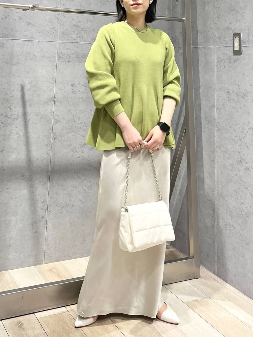 いつもご覧頂きありがとうございます✨☺️ フォローもして頂けると、とっても励みになります! ニットは、トレンドのペプラムデザインで、お尻周りをカバーできる着丈でした。厚みはしっかりあるものの、冬ニットのようなモコモコ感はありません。店頭では、年代も様々で、いろんな骨格体型の方がご購入されていました! サテンスカートは、高見えする生地感。フリートールサイズは、162㎝の身長でウエストで合わせても地面スレスレの長さ。肋骨下あたりに合わせてちょうど良い着丈になりました。ぺたんこ靴だと地面についてしまいますが、ズルズルに長めに履くのが、今年っぽい着こなしになります。 WEAR⇨@エムアイ