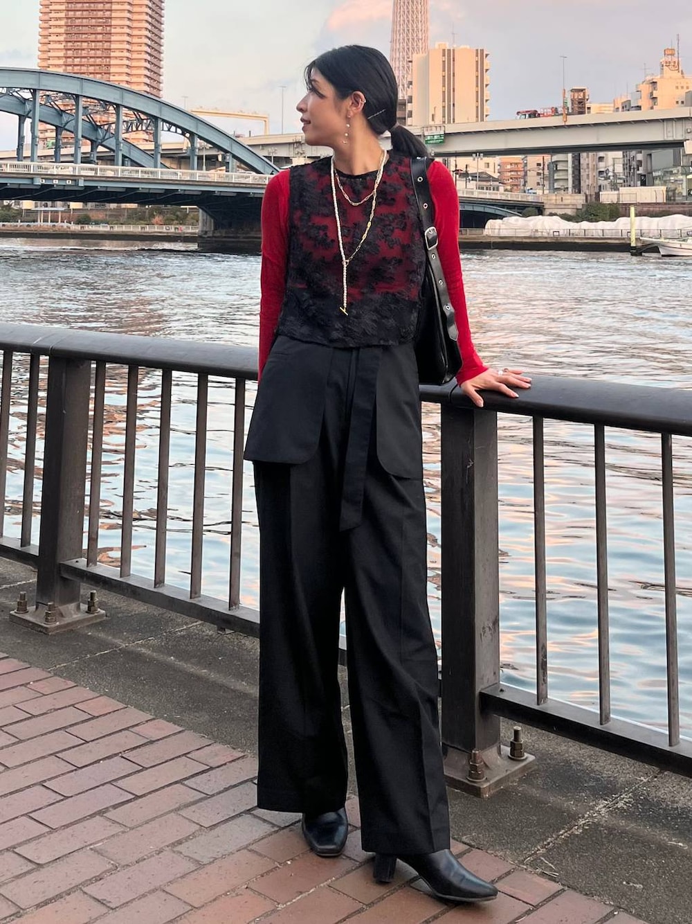 ▽▽▽▽▽▽▽▽▽▽▽▽▽▽▽▽▽▽▽▽▽ 今日のおでかけコーデ❣️ ホテルディナーにもぴったり! ベストは、レースで透け感があるので 重ねた時に軽く見えて、 春っぽさが引き出ます☘️ サイドに2つ調整できる紐があるので、 インナーの厚みによって、 サイズ感を変化させられます。 真っ赤なインナーは、滑らかで気持ち良い… 肌触りが良くてクセになります。 透け感は気になりませんが、 下着のラインはでます。 なので、キャミソールを重ねるか、 ブラトップを合わせるか、がおすすめです! 今期(というか秋?冬?)で終了の FOR I SERIES…プライベートでも着るくらい 大好きだったなぁ。 そんなFOR I SERIESのパンツは、 今年トレンドのエプロンタイプで、高見えします。 エプロン部分が若干フレアっぽく なっているので、パンツ部分がより 細く見える効果あり👀✨ 気になるヒップラインもカバーしつつ おしゃれできるのは嬉しい!! SALE価格になっているので、お見逃しなく💨 ▽▽▽▽▽▽▽▽▽▽▽▽▽▽▽▽▽▽▽▽▽ いつもご覧頂きありがとうございます🙌 フォローしてくださると とーーっても嬉しいです🥹✨ WEAR⇨@エムアイ