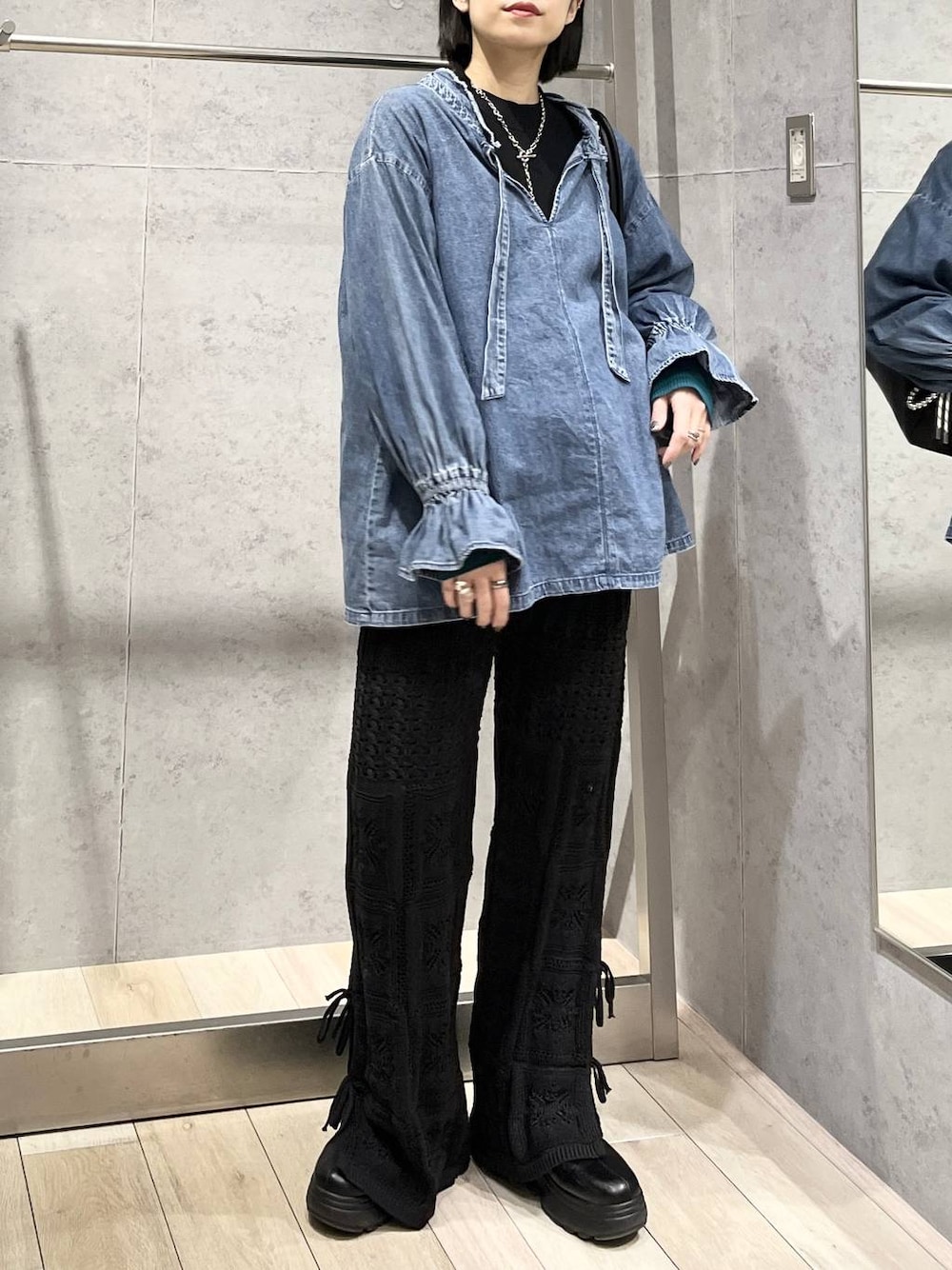 今日のリアルバイコーデ🩶 デニムシャツは、 柔らかい生地で、着心地も◎ 骨ストがだーーいすきな Vネックで、首周りもスッキリ✨ 8ヶ月のお腹で、余裕を持って着られました。 妊婦の私でもはけた!! インスタライブ後に 秒で購入したクロシェニットパンツ🖤 厚底ブーツをはいても 着丈がかなり長く感じます。 脚長効果バツグンです✨ ✼••┈┈┈┈┈┈┈┈┈┈┈┈••✼ ご覧頂きありがとうございます! 他にもこんなのやってます よかったら見てみてね🙋♀️ WEAR⇨@エムアイ