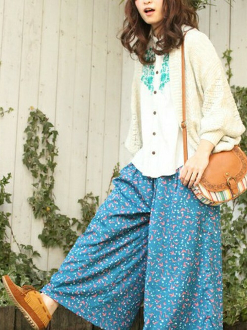 お花の刺繍がポイントのシャツと小鳥が舞うワイドパンツでイノセントな雰囲気に。パンツのボリュームと変形カーディガンのほどよいドレープがこなれた印象にしてくれます。