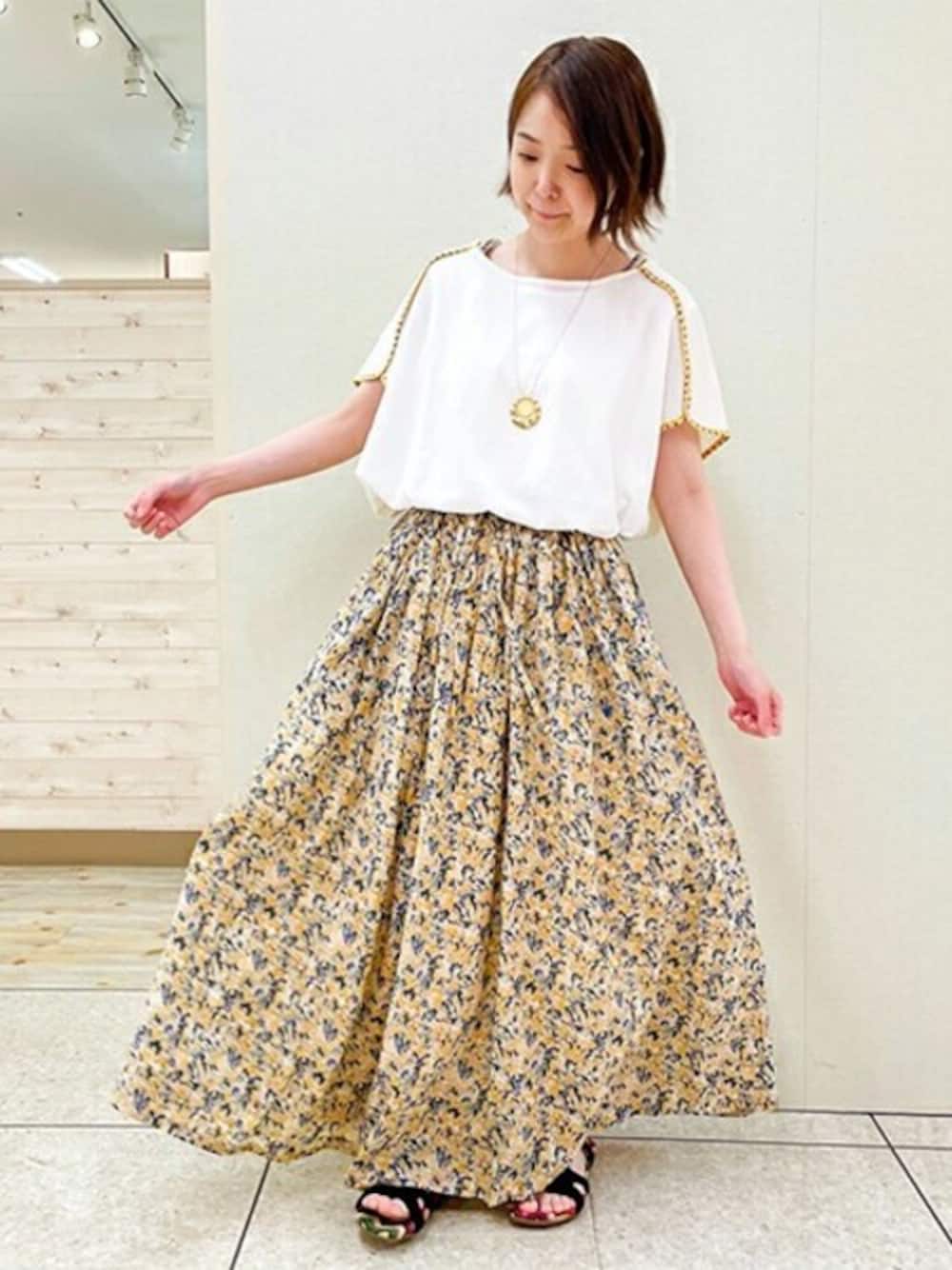 肩のチロリアンテープと袖口や切り替え部分に柄が入った可愛いプルオーバーに、優しい色合いの小花柄が上品なふんわりスカートとイエローで合わせた爽やかなコーデです!