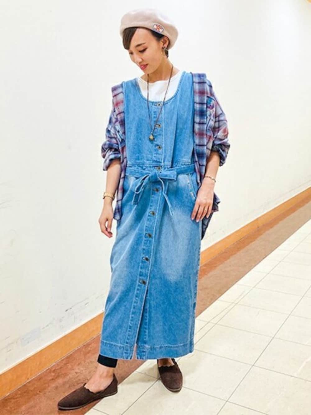 デニム+チェックシャツの鉄板コーデ★ ベレーとレギンスを足すことでグンと大人度がアップします。 こなれ感の出せる大人ラフコーデです!