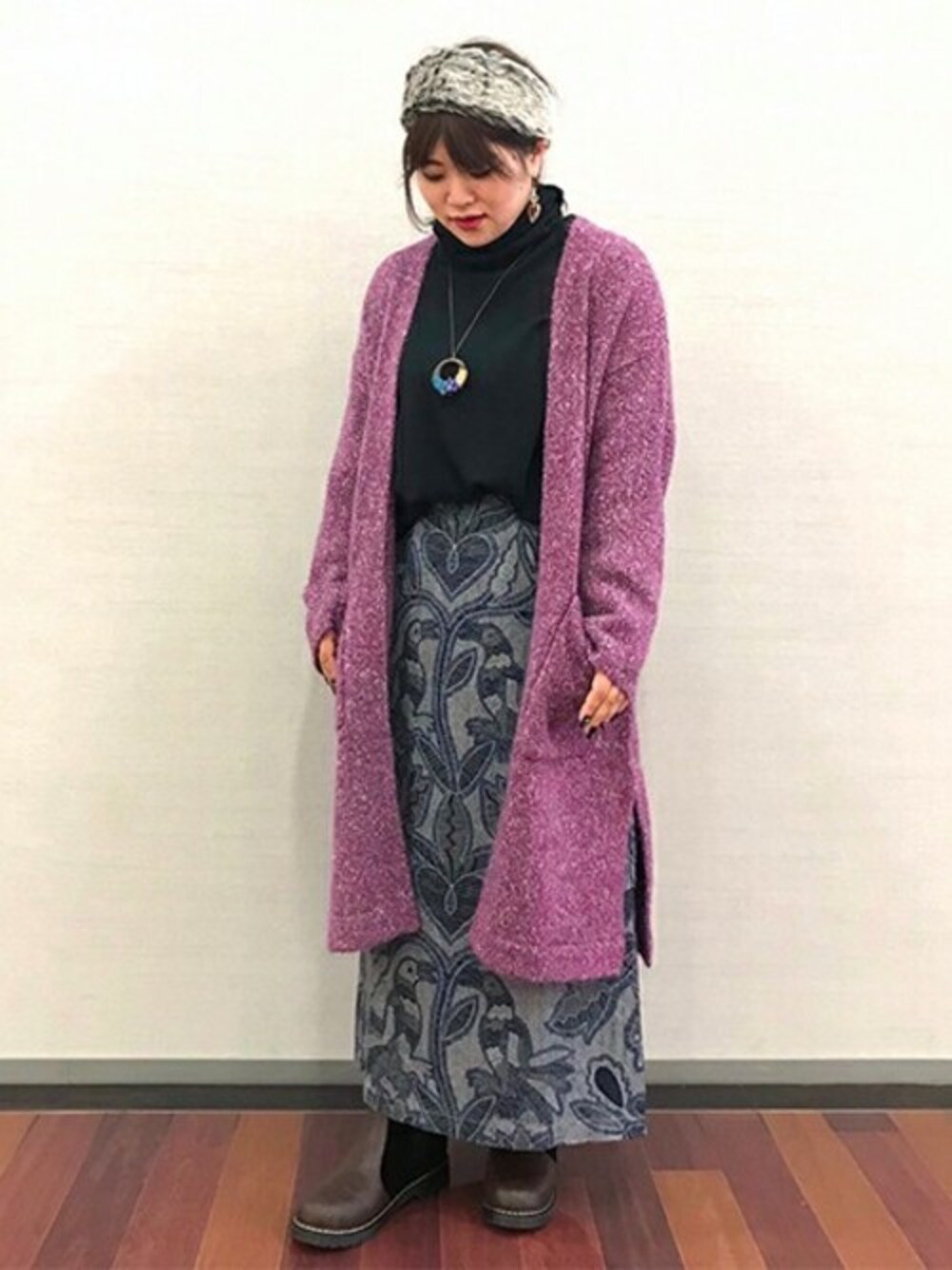 落ち着いた色味に差し色でカーディガンを華やかに☆ 長く使えるカーディガンは何色あっても◎ 柄も取り入れた大人個性的コーデ♡