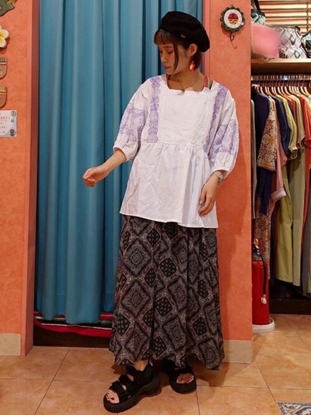 ブラックとホワイトでまとめた 大人っぽいコーデがテーマ🤍🖤 ペイズリーとバンダナ柄がチチカカの お客様の心を揺さぶるはずです🙌笑 リメイクでウエストはデニム生地に~👖🌼