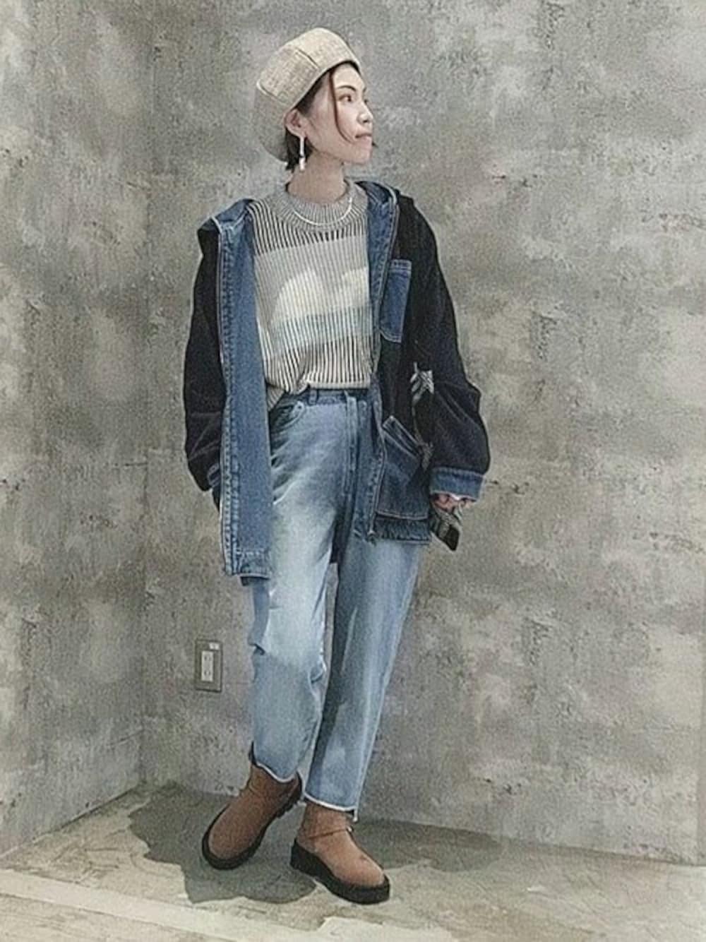 男女兼用で着れるリバーシブルジャケットをメインにしたデニムコーデ☆ 裏表どちらも使いやすく万能♪ インナーのマルチカラーセーターは絶妙な配色でシンプルながらお洒落に見えるアイテムです!!