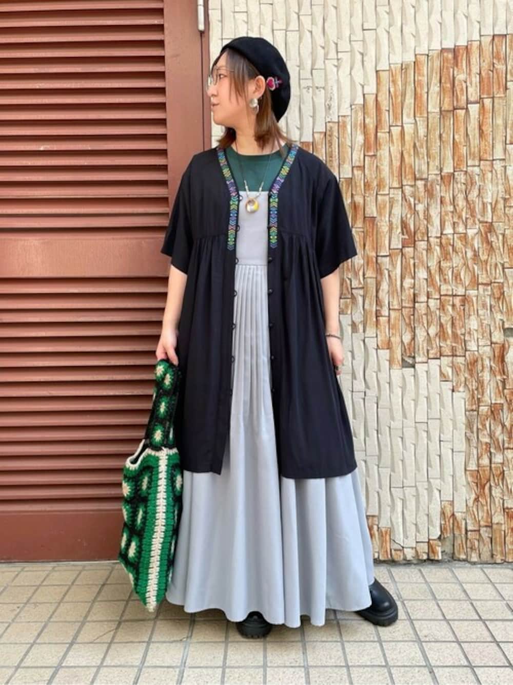 さらっさら、ふわりの生地感が気持ちいいチュニックワンピをキレイ見えするサロペスカートに羽織ってみました☺️🍃 生地がたっぷりで動くたび揺れるのがたまらなくかわいい💓 基本はモノトーンでまとめて、ちょこちょこグリーンを差してるところがこだわりポイント💡