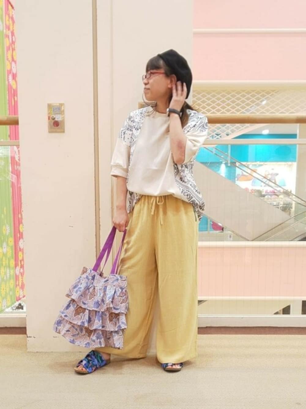 バンダナ切り替えがおしゃれなTシャツにふんわりボトムスでかわいらしく!