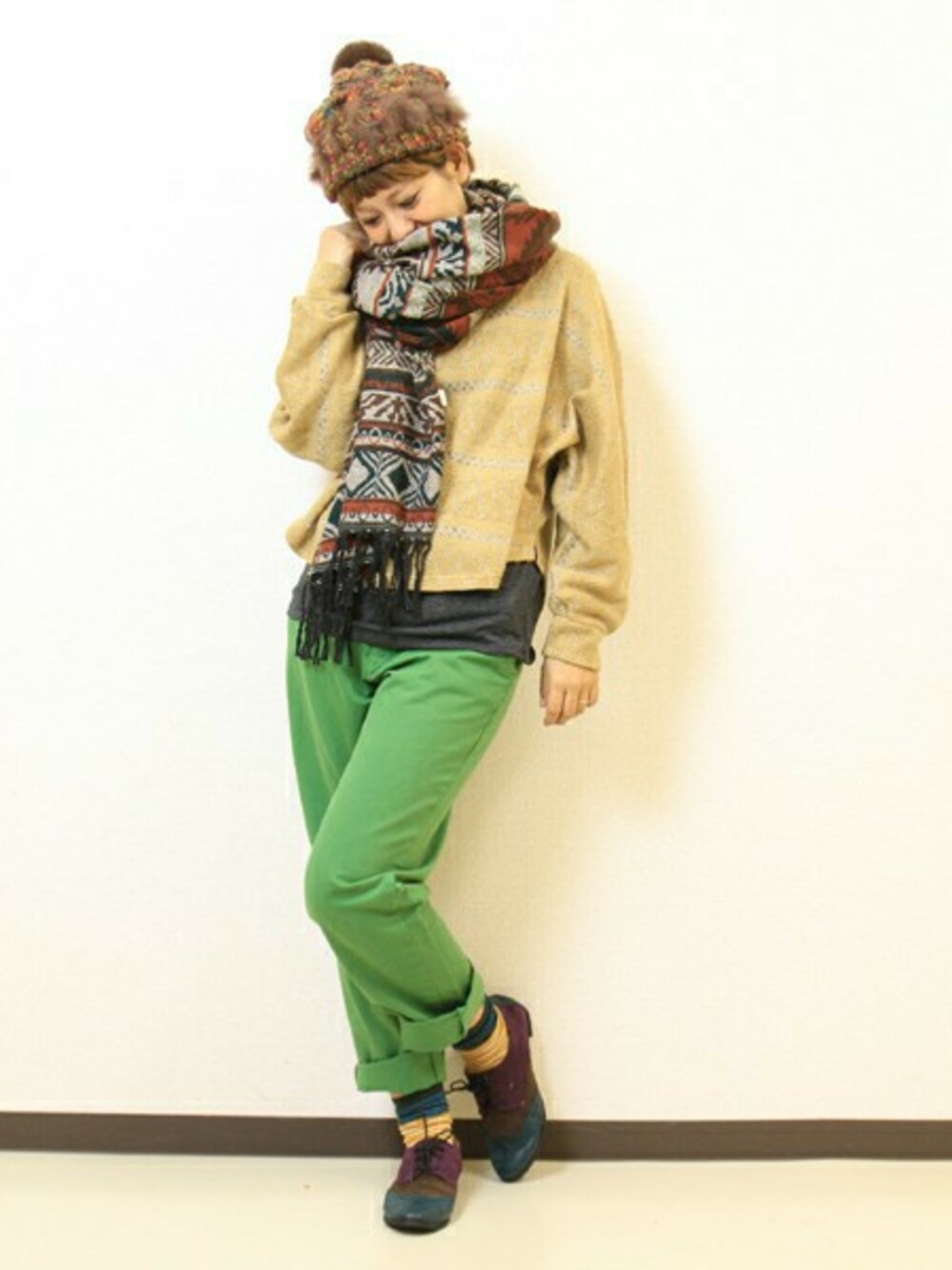 秋を感じるアースカラーでまとめたコーディネート。 深みのある緑のパンツにはキラリ光るラメ入りのトップスを合わせて。 ドルマン袖がアクセントになってこだわりのポイントに◎ 民族調のストールをくるりと巻けばあたたかみを感じられ、よりエスニックな雰囲気に。
