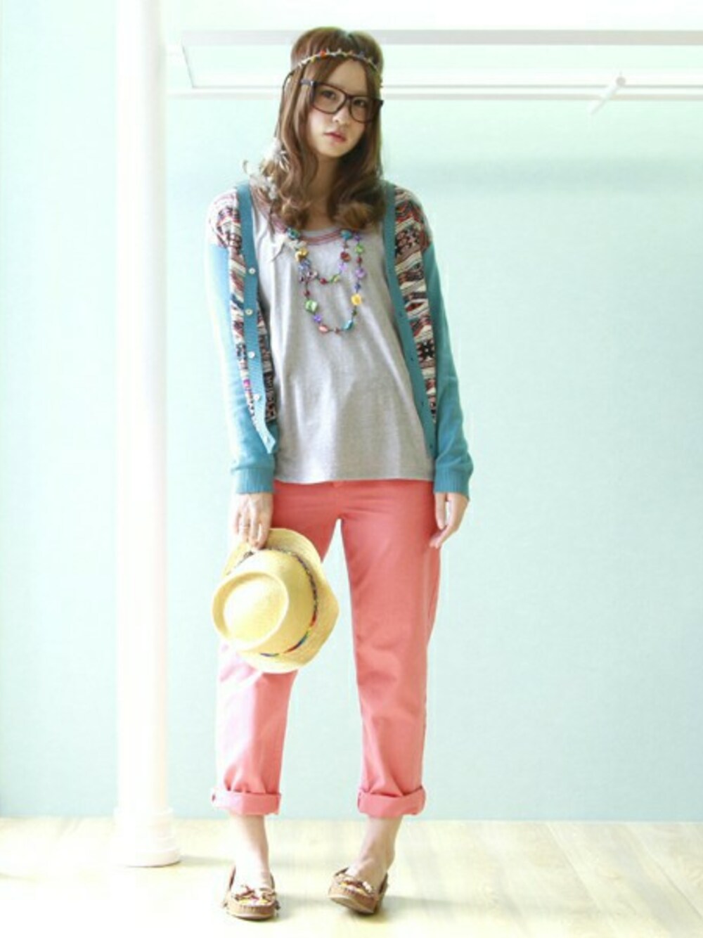 春らしい色合いで統一した羽織りスタイル。旬であるマカロンカラーを思い立たせるビビッドなカラーパンツでトレンドをおさえて♪透明感のあるガラスビーズをモチーフにしたアクセサリーを合わせたPOPなポイントも☆