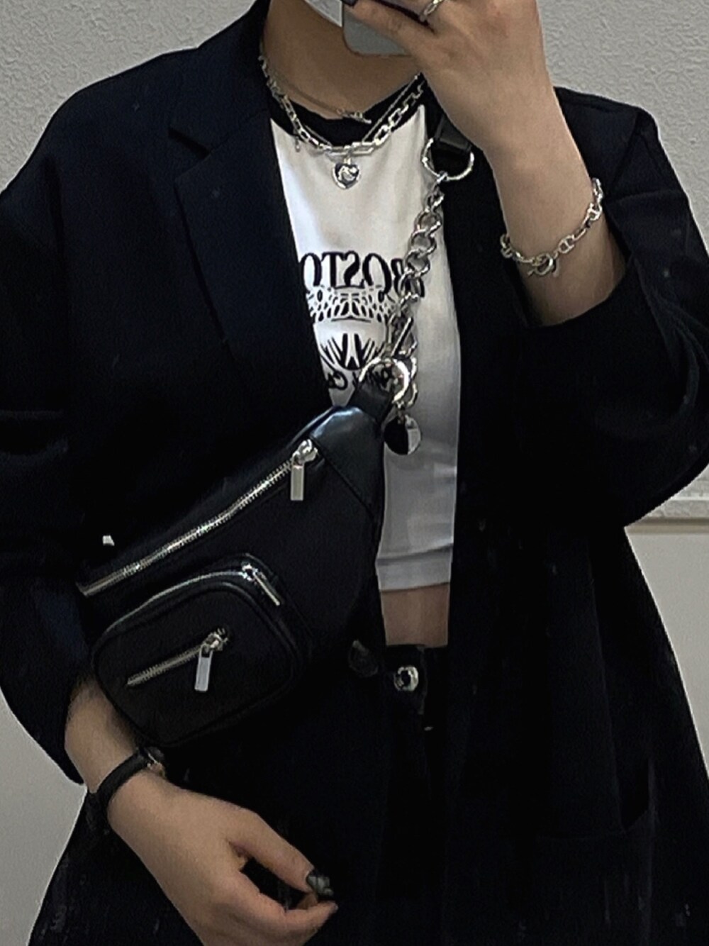オールブラック×シルバーのアクセサリーを付けるとアクセサリーが目立ってさらに可愛いです🤍 黒×白は間違いないので差し色に白入れるのはかなりおすすめ‼️
