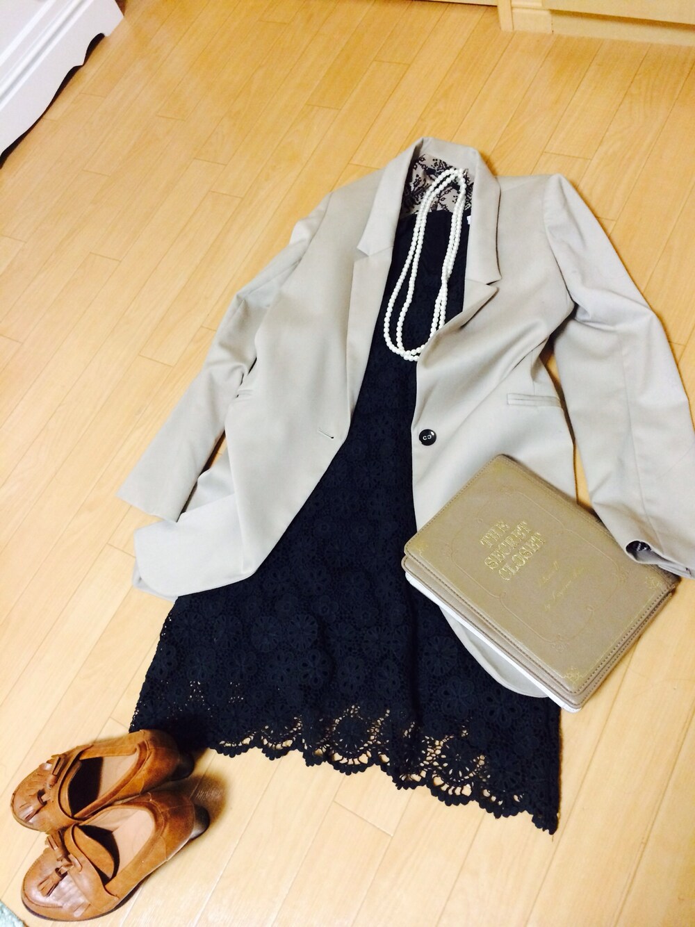 クラッチバックは本型のクラッチバックにしました♥︎∗*゚ε٩( º∀º )۶з あとお洋服は ベージュのテーラードジャケットに クロシェワンピ◡̈♥︎ パールのネックレスは2連✩*॰¨̮