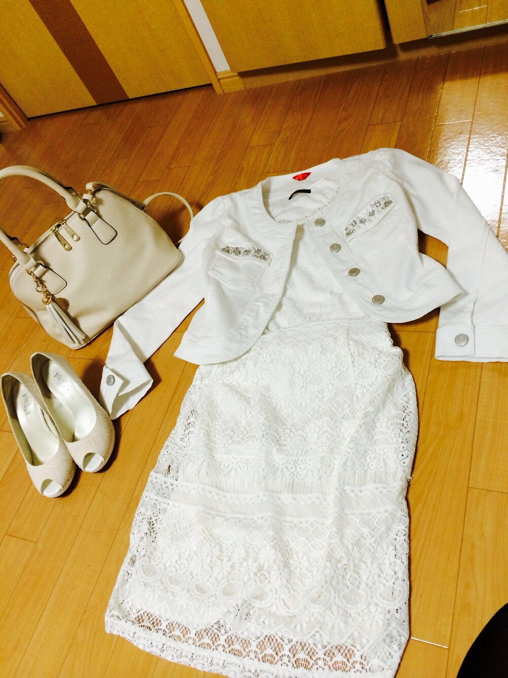 ホワイト✖︎ホワイト〜‹‹\(´ω` )/››~♪ 汚しそうだけど(笑) ホワイト✖︎ホワイト好きです✧*。٩(ˊωˋ*)و パールとビジュー付きの短めGジャンお気に入り♡ᵕ̈*⑅୨୧ トップスもレースにパール付き☆ レースのスカートに バックと靴もホワイト〜✩°。⋆⸜(ू。•ω•。)
