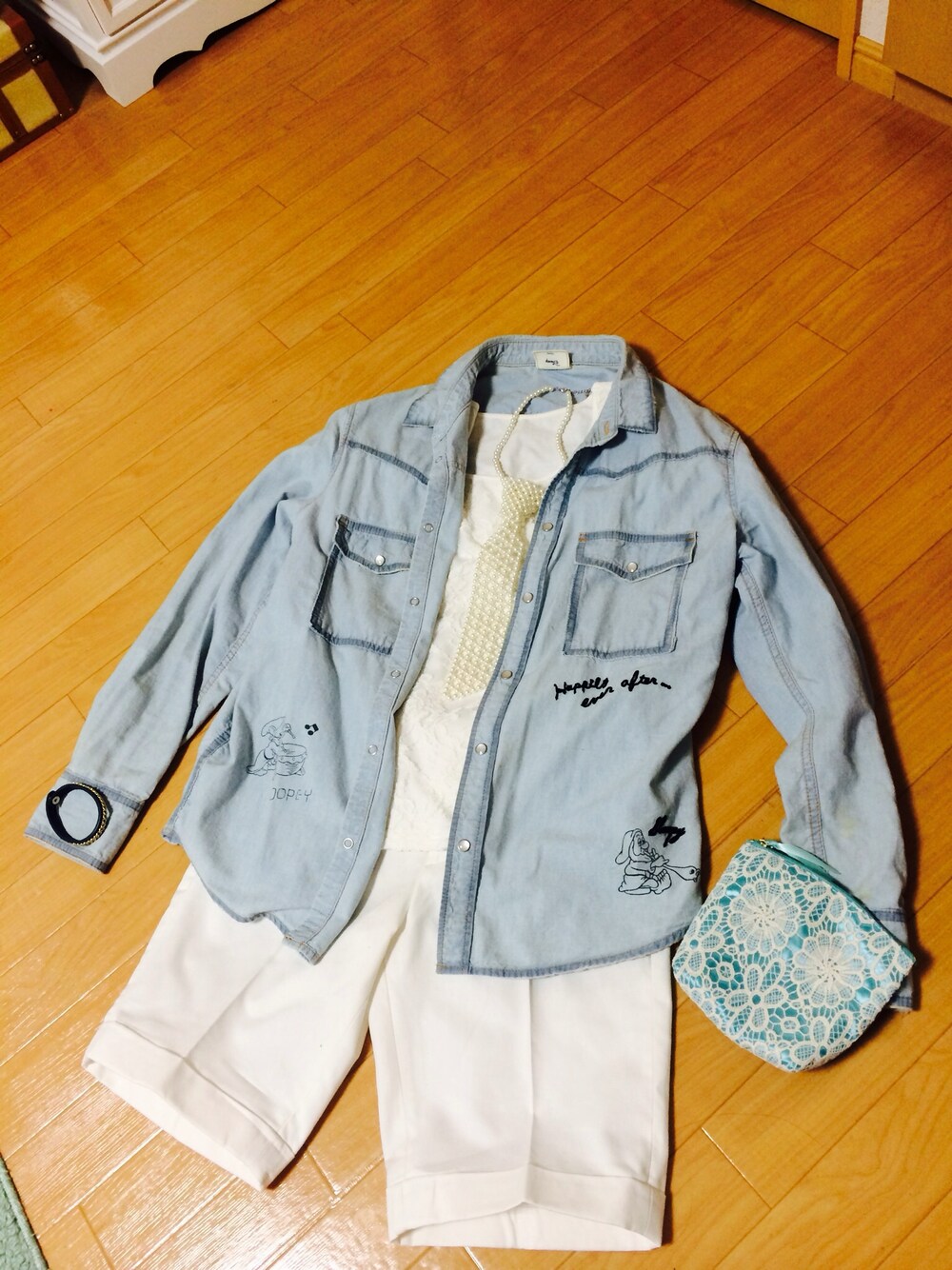 デニムシャツ〜✧*。٩(ˊωˋ*)و✧*。 SLYとディズニーコラボで、白雪姫のデニムシャツにレーストップスとホワイトのハーフパンツを合わせてさわやか〜な感じにしました‹‹\(´ω` )/››~♪