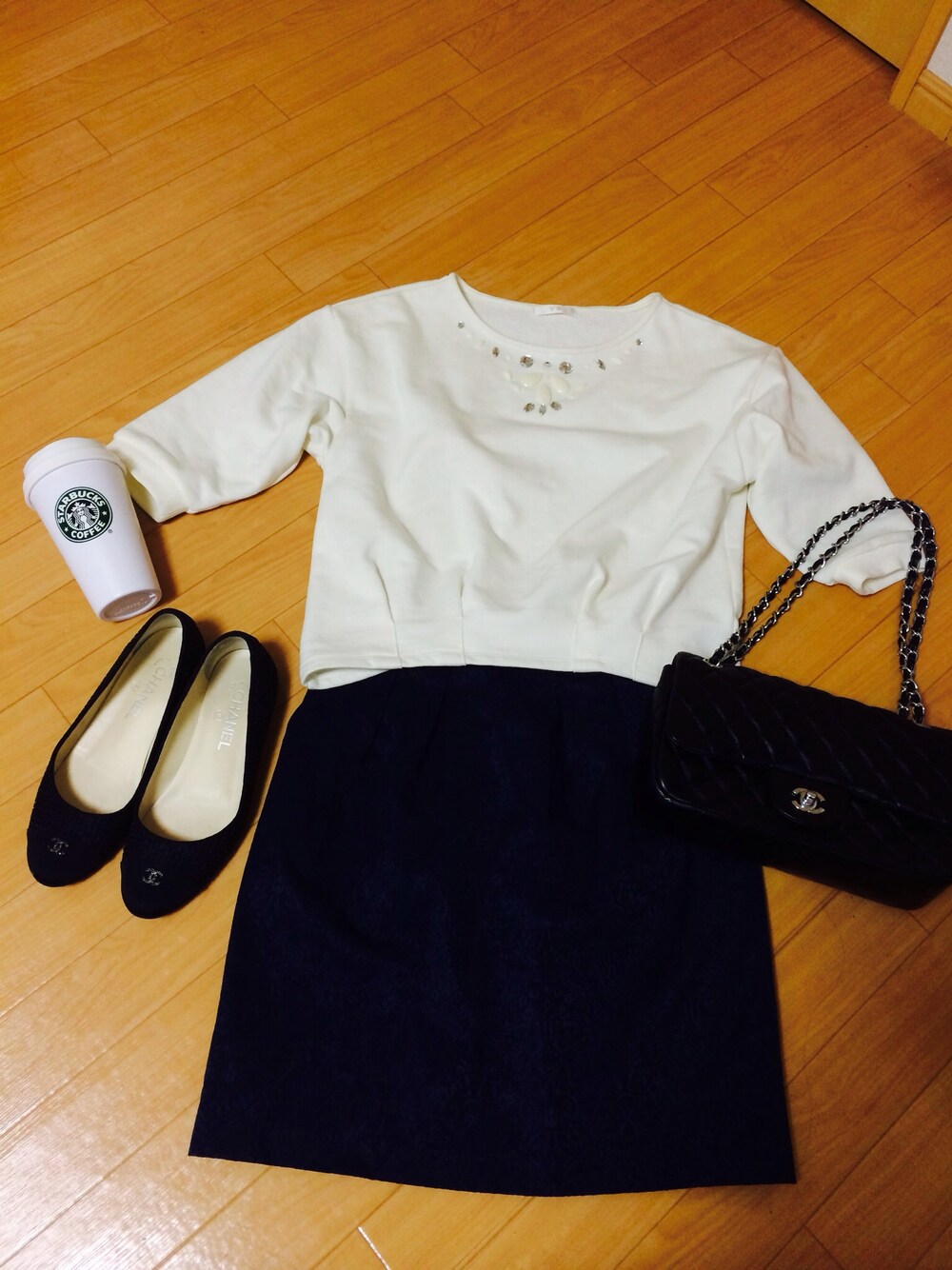 チェーンバック♥︎♥︎♥︎(♡´∀`) CHANELのチェーンバックにしましたʚੂ⍢⃞ོɞੂ あとはスエットビジュートップスに ネイビーの柄スカートに CHANELのぺったんこ靴を合わせて.。.:*♡