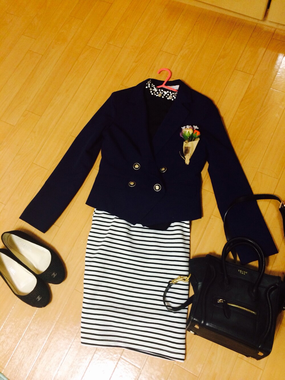 卒業式なのでブレザー的な( ⁼̴̶̤̀ω⁼̴̶̤́ ) あとお花も☘ ブレザーの中はビジューつきのタートルネックにボーダータイトスカートを合わせて(*ゝωб*)b ˂ᵒ͜͡ᵏᵎ⁾