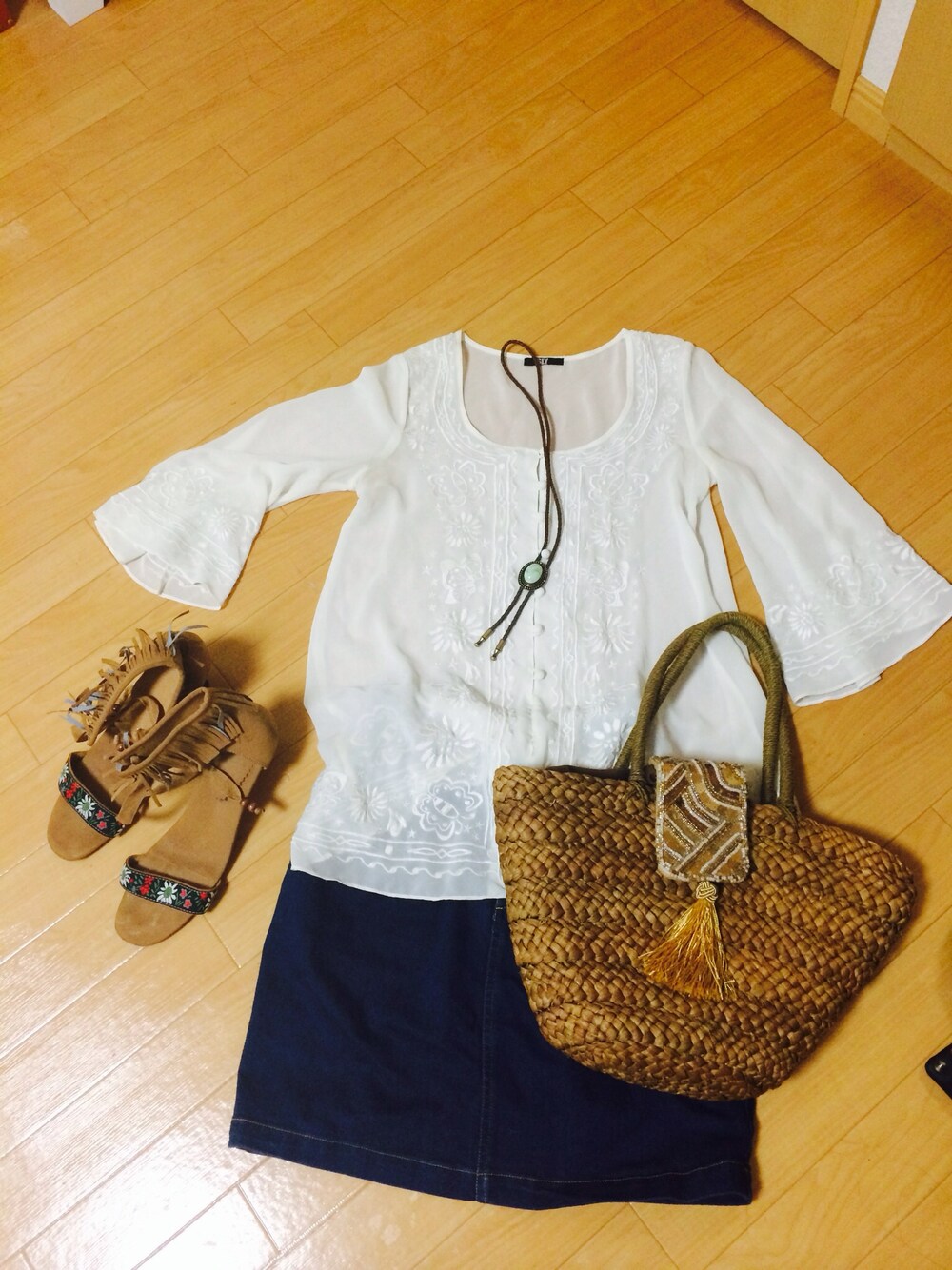 SLYの刺繍入りチュニックに デニムスカートと フリンジのサンダルにビーズつきのカゴバックを合わせて春らしく(´>∀<`)ゝ☘☘☘ あとターコイズ差し色に(๑˃̶͈̀ ꇴ ॣ˂̶͈́๑) ˂ᵒ͜͡ᵏᵎ⁾