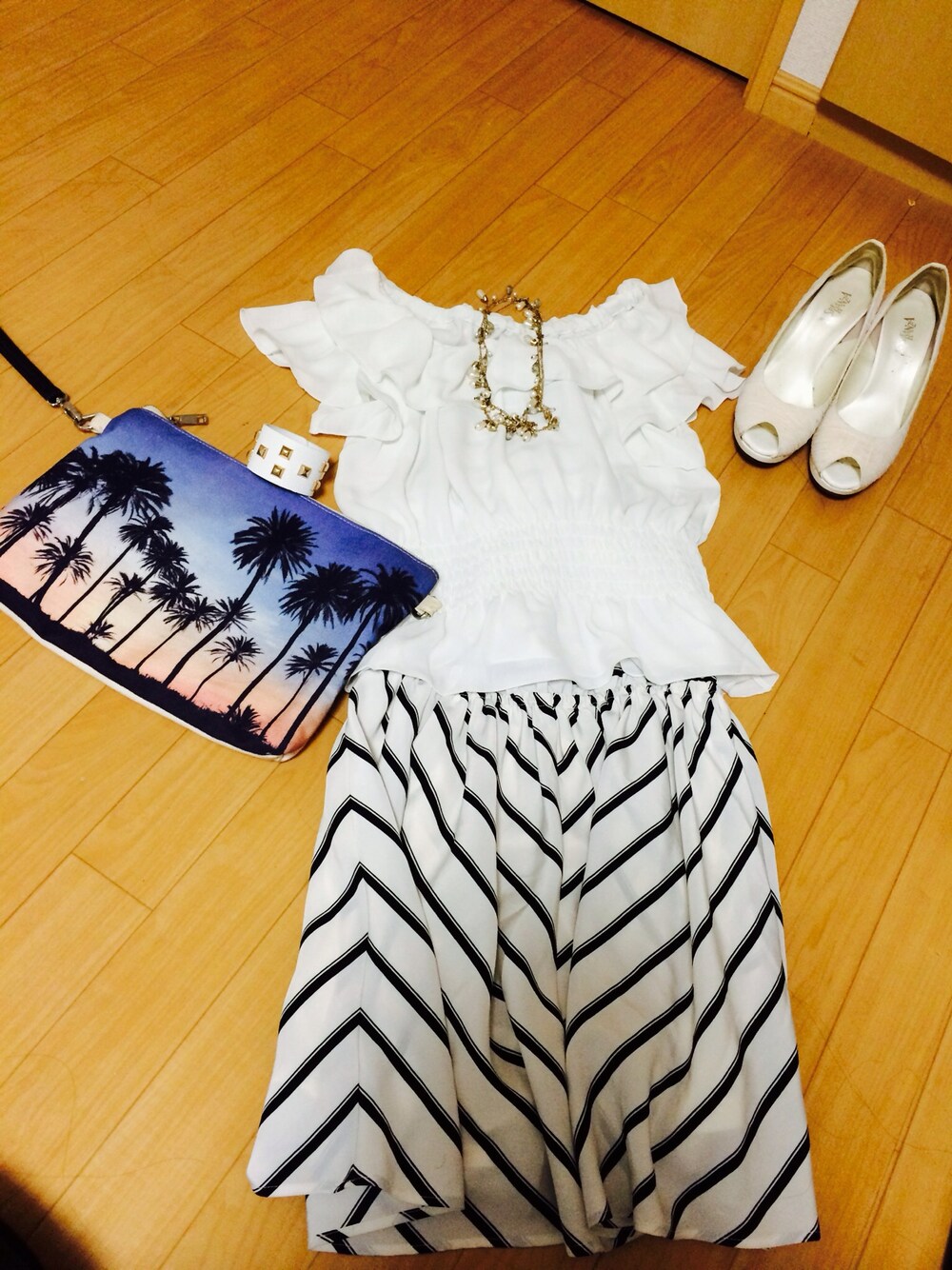 ショート丈トップス☻ ヘザーのシフォントップスに ボーダーワンピを重ね着(♡´∀`) ヤシの木柄バックに ホワイトパンプス シェルとパールのネックレスと ホワイトスタッズバングルを アクセサリーを合わせて(♡˙³˙)°