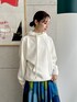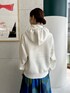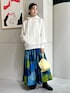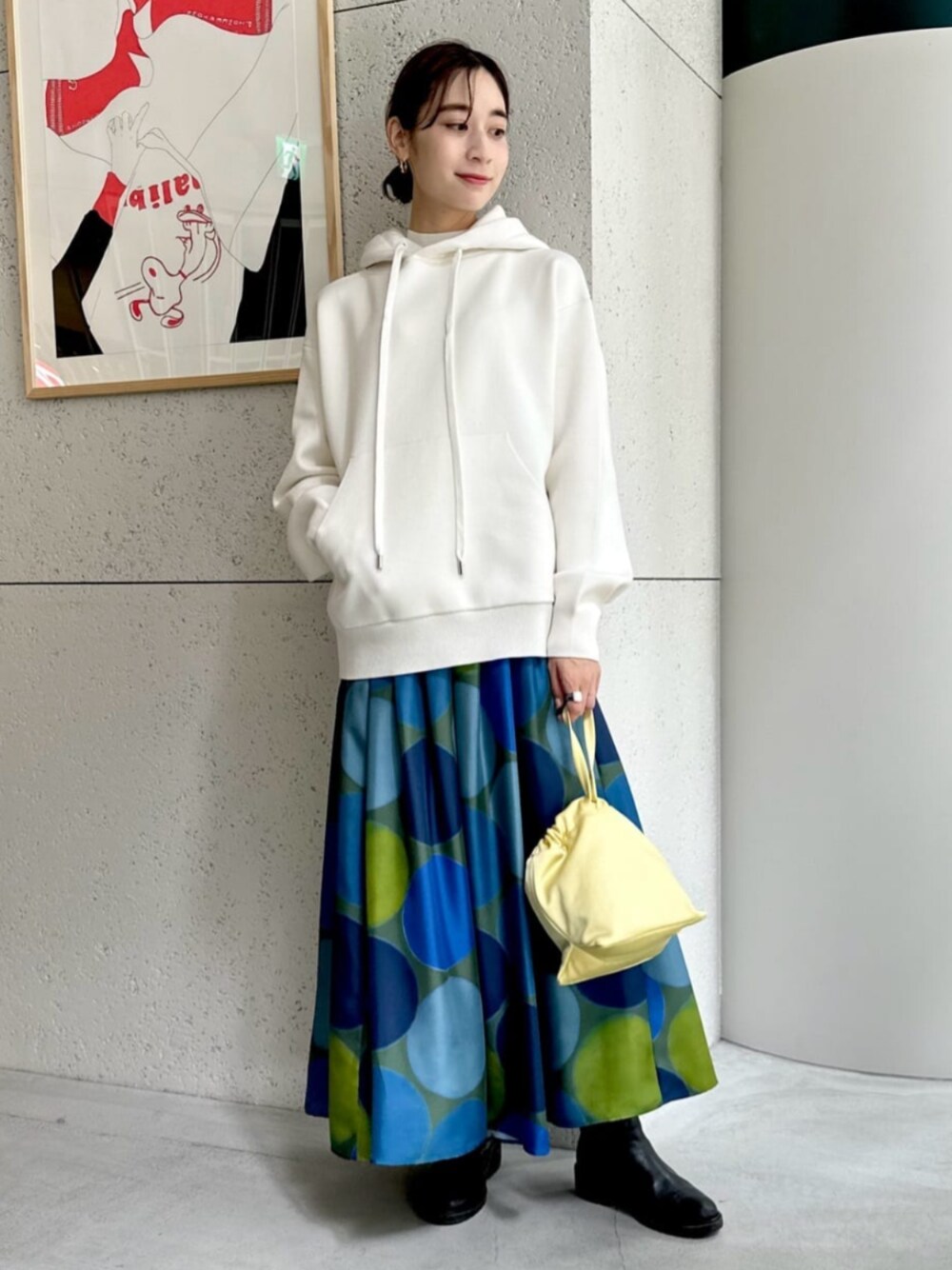 ゆったりシルエットの〈CABaN〉定番パーカーに、ドット柄が目を惹くシルクスカートを合わせ女性らしいスタイリングに。