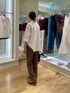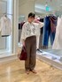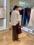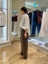 着映えレースの万能レースシャツで、きれいめパンツコーデを考えました。 立体感ある大柄のコードレースが前面にのみ使われ、肌見せとレイヤードが楽しめます。 オーバーサイズですが薄く軽やかな素材感なので、着られてる感が出ません。 秋に向けて、インナーとボトムはブラウンで揃え、小物もシックなカラーを選びました。 パンツは36サイズ着用です。 とろみ感あるブラウンは今年のトレンド! 普段ならベーシックに黒を合わせがちなところをブラウンに変えると、一気に旬なムードになります。