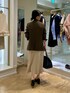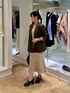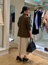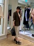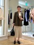 ジャケットからちらっと覗かせたいラメニットをベースに秋色のお仕事コーデを考えました。 いつもならスカートにインするのですが、腰回りすっきりなスカートを綺麗に履きたいので、オーバーで着ました。 裾のリブで少したくしあげ、さらにベルトでウエストマークしています。 ニットとスカートがワントーンでややぼやけるので、小物はブラックで統一して引き締めました。