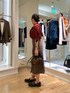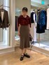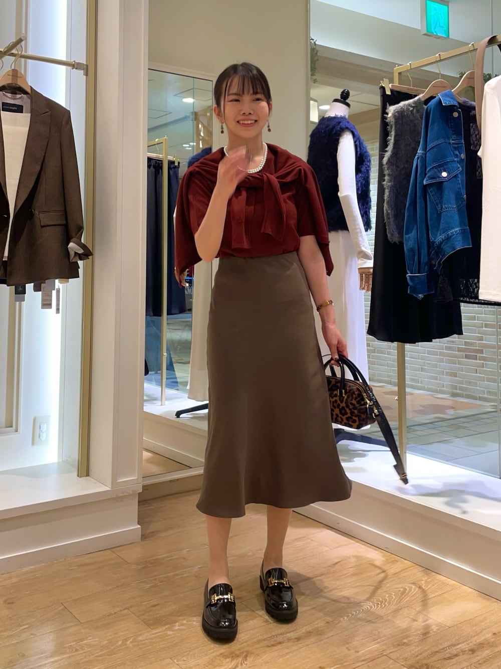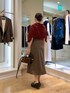 The 秋色のボルドーニットは店頭での一目惚れも多い人気カラー❤️ ウール100%なので吸湿性・速乾性に優れており、気温が安定しない今着るのにちょうど良いです。 スカートは薄軽フェイクスエード、お家でお洗濯可能です。 腰回りにダーツやタックがなく、フィット感のあるスッキリしたシルエットで、いろいろな羽織・ボトムとの相性が良いです。 カーキなのでトップスと反対色ですが、彩度が低めの落ち着いたカラーなので上手く纏まります。 海外スナップのようなカラーリングがお気に入りです。 クラシックなコーデなので、バッグは強めなアニマル柄で外してみました。