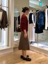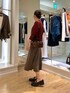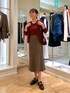 店頭では一目惚れも多いボルドーのニットアンサンブル。 カーキのスカートと合わせて海外スナップのようなカラーコーデです。 ウール100%なので吸湿速乾性に優れており、気温が安定しない今着るのにちょうど良いです。