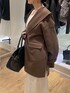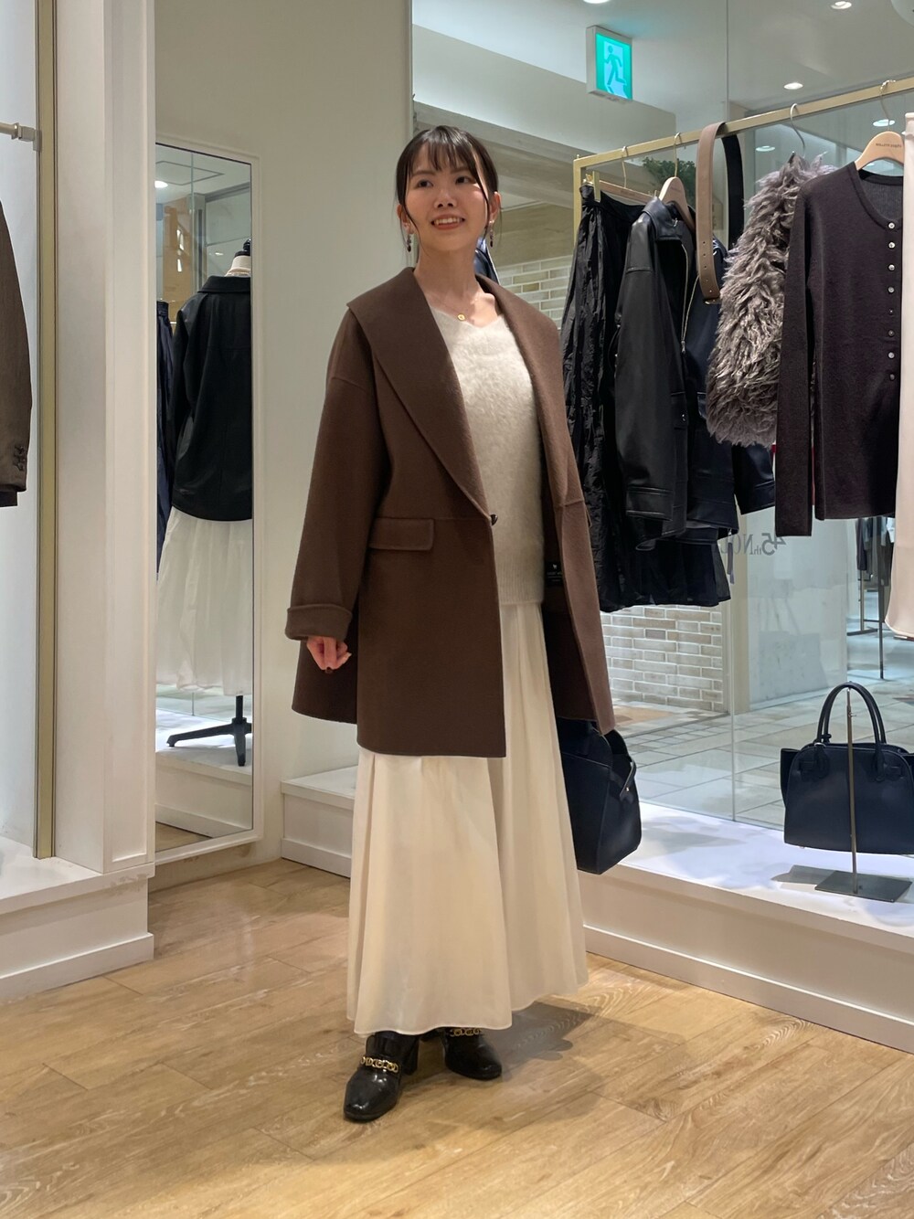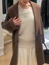 上質な生地感ですが、 コートってこんなに軽かったっけ?! と思うほどの着心地です。 リバーコートですがあえて背抜き仕立てにしており、モフモフのニットを着ても袖口でもたつかず、着膨れもしません。 秋冬は重厚感ある色や素材が増えがちなので、淡色ワントーンを中に着てみました。