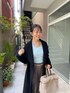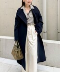 襟の形やウエストベルトがエレガントな The ロングコートを同系色でまとめました。 柔らかい生地感で、総のロング丈でも重たくありません。 着丈は去年より短くなり、小柄な方も挑戦しやすくなっております。 普段なら36サイズのところ38サイズを着用しましたが、長すぎ・大きすぎな感じもなく、ロングスカートの裾がしっかり覗くバランスとなりました。