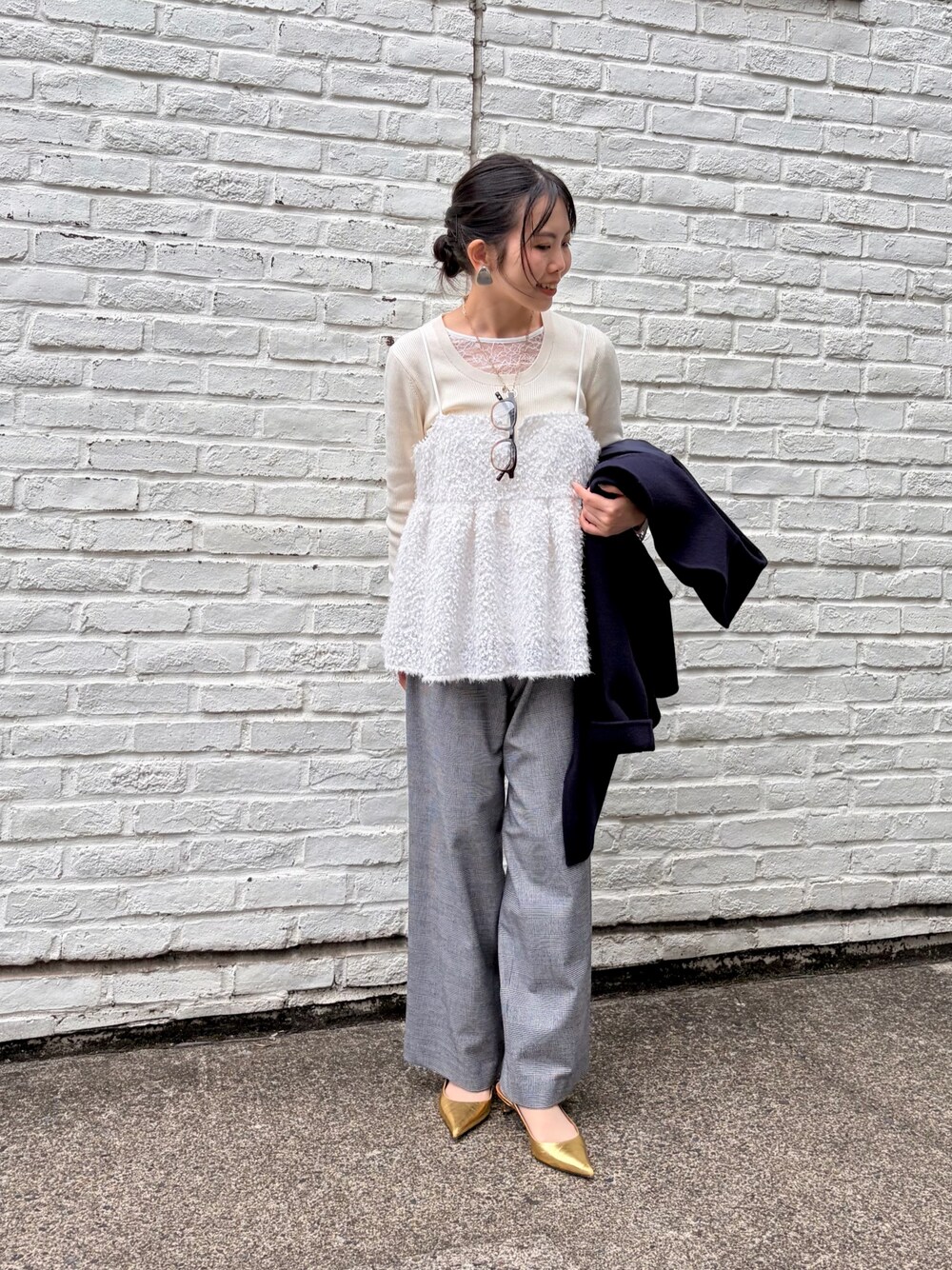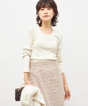 ホワホワの素材感がかわいいフェザーチュール🪽 3色展開ですが、やはり白が透明感No.1 レースT+カシミヤ混ニット+ビスチェの3枚を重ね着しております。 胸下切り替えですが、フレアが緩いので骨ストの私でも着膨れ感ナシでした。 ホリデームード高まるおすすめのプラスワンアイテムです。