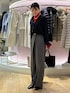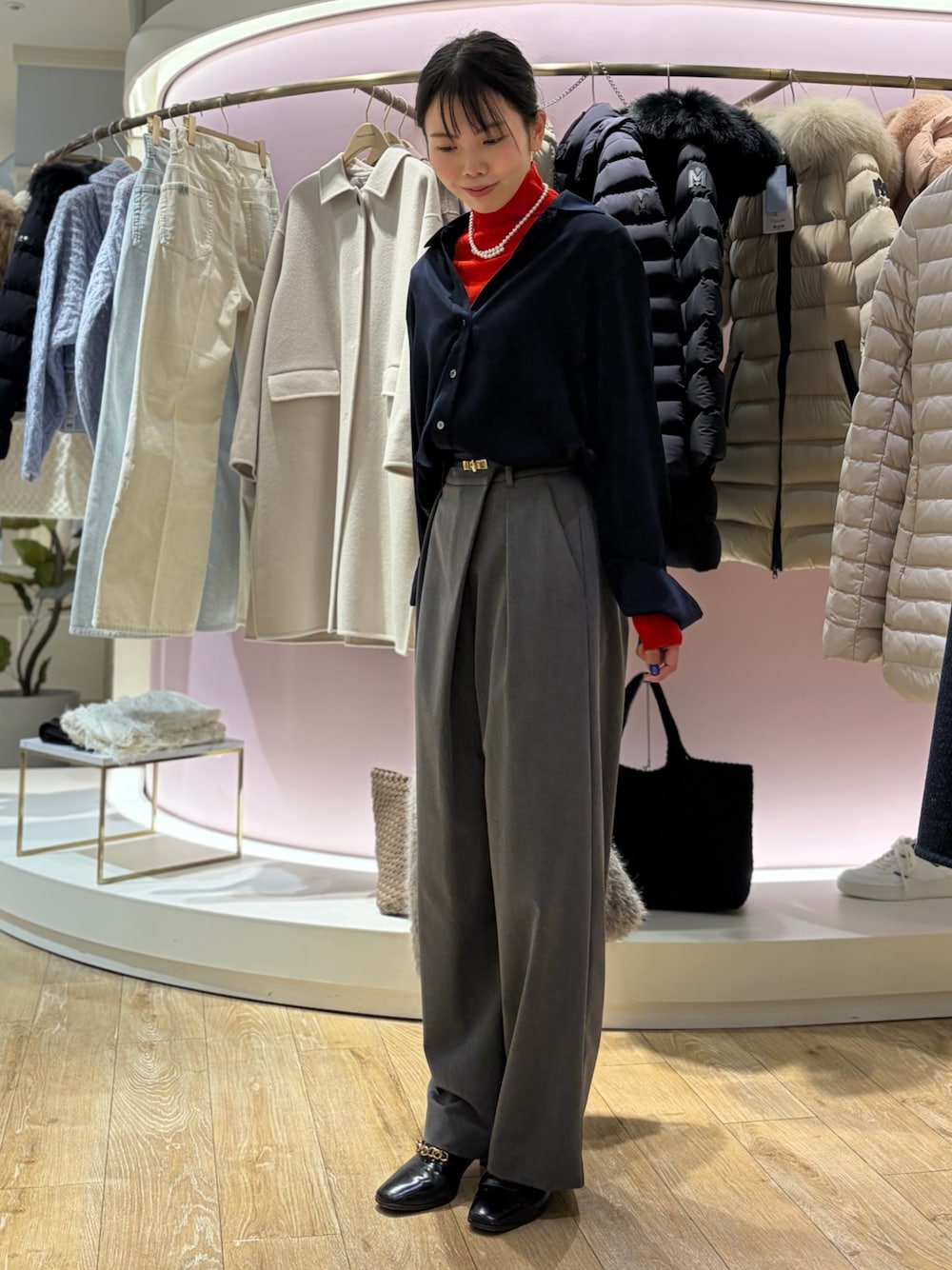 普段は選ばないハイネックニットも着てみました。 クリスマスっぽく、差し色にぴったりな鮮やかレッド! 本当は一枚目の左袖みたいに、カフスからニットの袖口を覗かせたかったです💦 首周りより少し余裕があり、詰まりすぎないので、苦しげな感じはしないのかなと思います。 スエードのような素材感のツヤツヤシャツは、タイプライターやオックスなどの素材を使ったシリーズよりコンパクトなサイズ感で、重ね着しても女っぽいシルエットです。