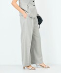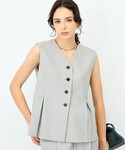 ジャケットとパンツはサイズ展開があるのですが、サンプルのため38サイズを着用しています。 ジャケット+ジレ+パンツの3ピースでフォーマルなシーンやお仕事にぴったりのセットアップです。 それぞれ単体でも着回しが効くので、一揃え持っていると毎日のお仕事服に悩みません! ジャケットは隠しファスナーでスリットができるので、こなれた着こなしにも挑戦できます。 ジレはタックで女性らしいラインをとっており、ノースリーブトップスとして一枚着もできます。