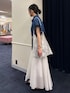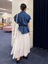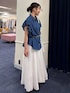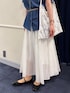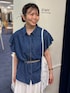 サンプルのため、スカートは38サイズを着用しています。 動きのあるラッフルスリーブが可愛いだけでなく、二の腕をカバーしてくれるデニムブラウス! 春先から着られる厚さで、夏はさらっと涼しい素材感です。 量感たっぷりなオーガンジーのフレアスカートは夏にかけて特におすすめのアイテム🌻 撮影の日、濃色のインナーを着ていて透けが少し気になったので、いつもならトップスインするところですが、オーバーで着てベルトでウエストマークしました。 素材感のメリハリで季節感を感じられるコーデを意識しました!