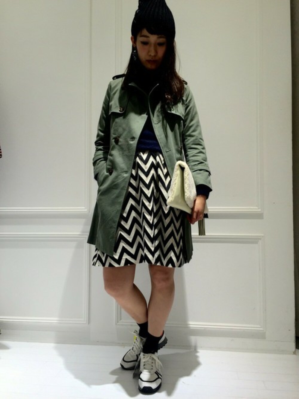トレンチコートとスカートのレディスタイルをスニーカーではずすコーディネイト♡♡ トレンチの間から覗くスカートの柄感も可愛い一枚です♡