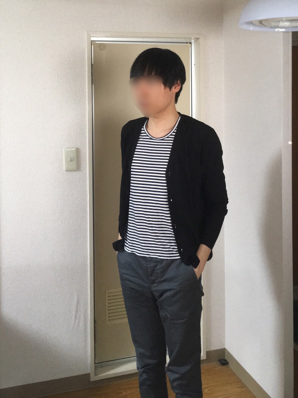 黒カーデ、ボーダーT、グレーチノパン。ベーシックなもので合わせてみました。やはり黒カーデは万能ですね。夏でもモノトーンの服を着たい!