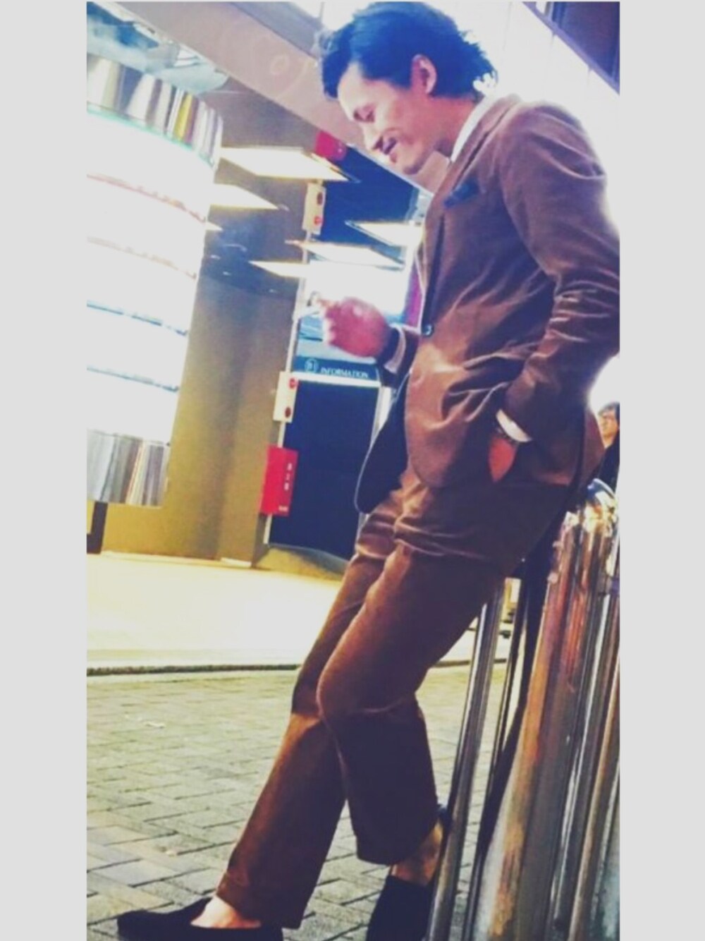 on snap#6 ブラウンのセットアップは目立ちますね。 ネクタイは暗めのグリーンで。