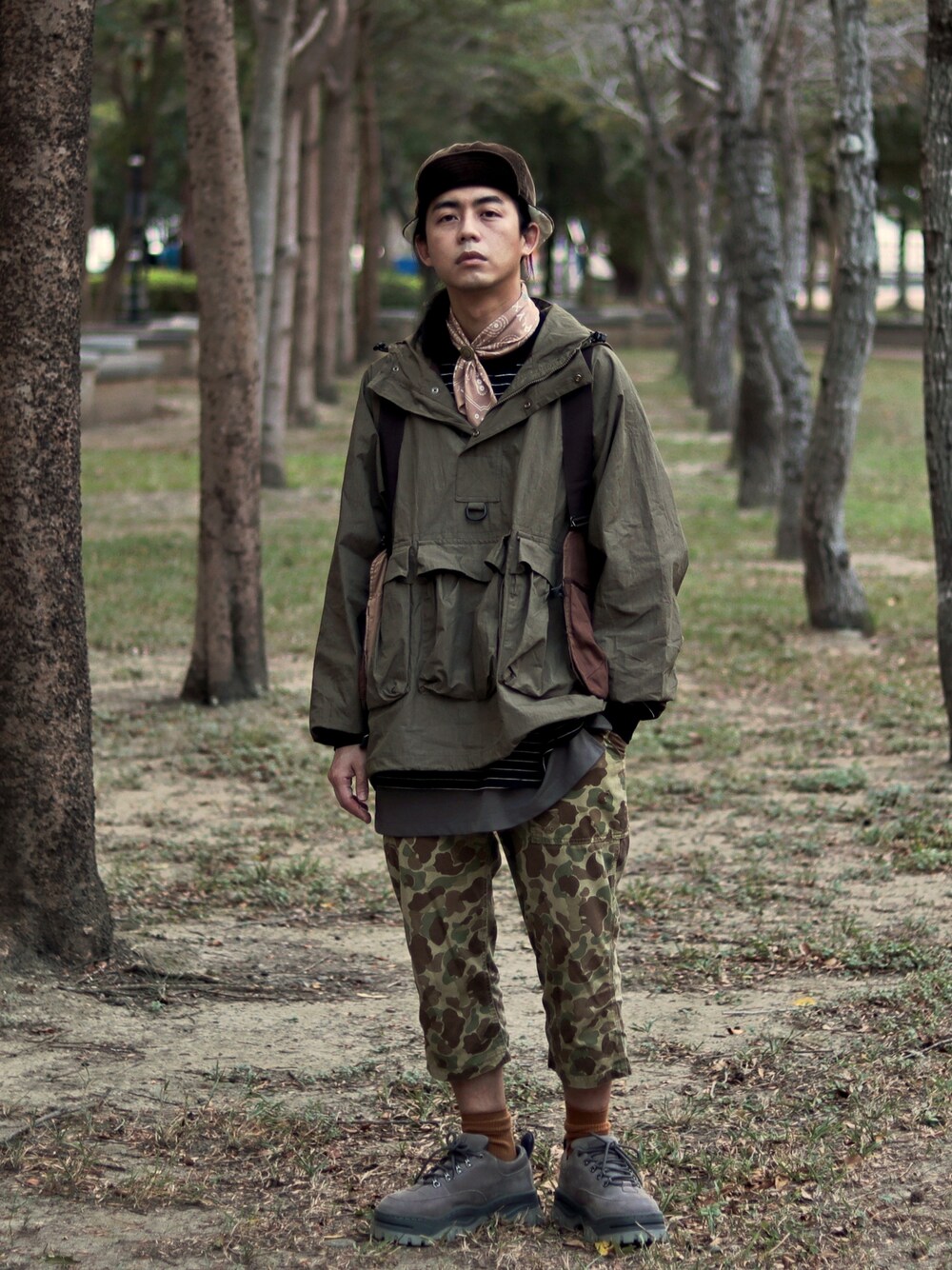 Instagram : onuswc Youtube : 家庭兄弟 Familybros 上身用Anorak打開露出長袖T領口, 以及下擺內搭、長袖T、Anorak長短差做層次, 整體做出上寬長下窄短的比例, 色系上以綠與棕色呼應, 並用淡橘色領巾當作亮點。 感謝大家收看!
