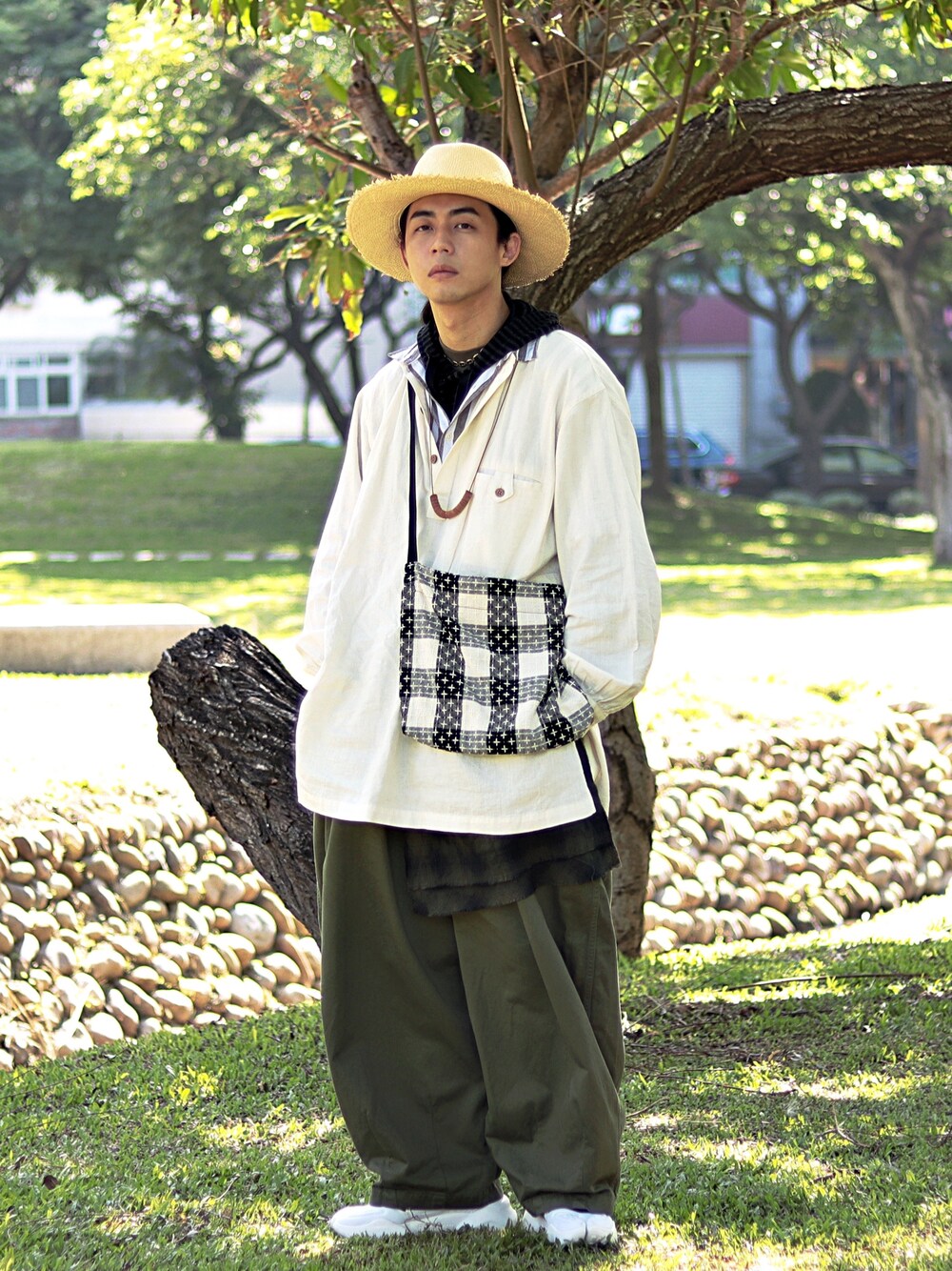 Instagram : onuswc Youtube : 家庭兄弟 Familybros 這套smock、襯衫、素T頸部層次, 並用黑白格斜背包裝飾點綴, 下身用寬褲讓整體呈現全寬鬆比例, 色調上淺色和草帽帶出夏天的季節感。 感謝大家收看!