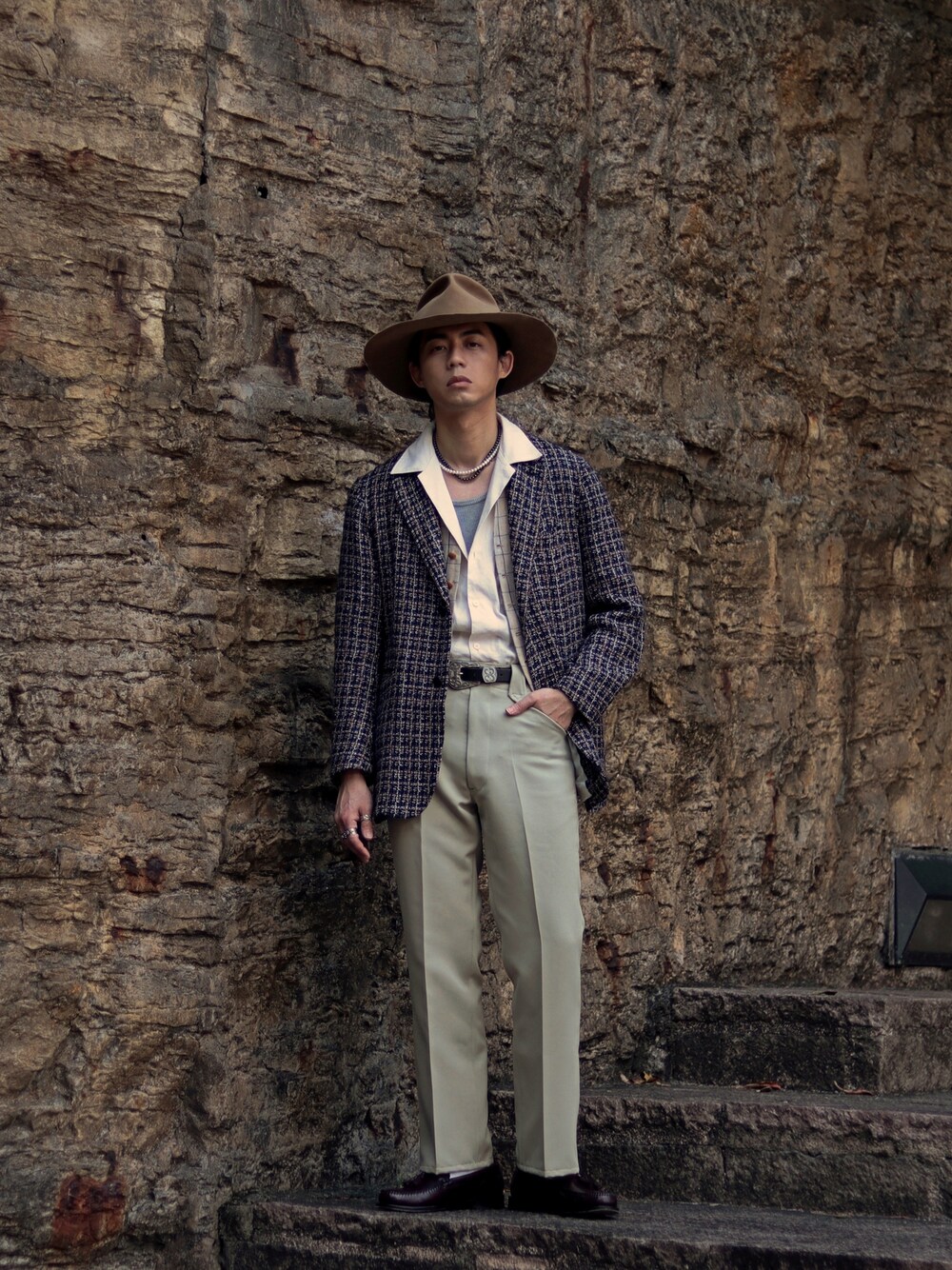 Instagram: onuswc Youtube : 家庭兄弟 Familybros 這套是去2023 Suit Walk的穿搭, 當然不免俗的還是要穿件西裝外套, 然後開領襯衫把領子放在西裝領外, 內搭露出一些以及背心不扣都做出層次, 下身選用合身有燙線的褲子, 長度剛好可以完整露出樂福鞋, 並且些微露出一點白襪, 整體使用了皮鞋、西裝外套、燙線褲, 讓風格上更有紳士裝感。 感謝大家收看!