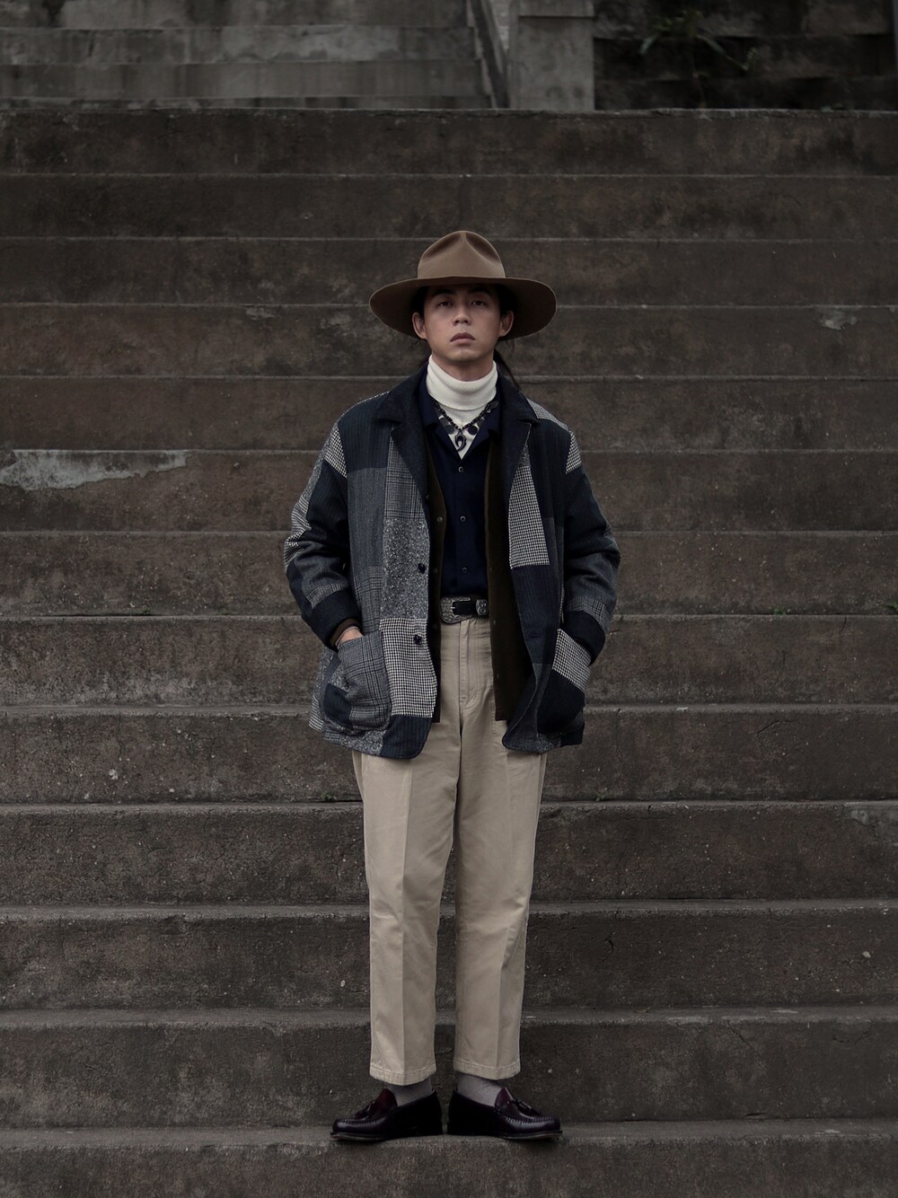 Instagram: onuswc Youtube : 家庭兄弟 Familybros 這套高領毛衣、襯衫、外套疊加, 在頸部和身體處做出層次感, 整體形成些微寬鬆上短下長比例, 再以上身紮入褲中拉長腿比例, 九分褲腳露出灰色襪也做點小層次, 然後用拼接外套當作整身重點。 感謝大家收看!